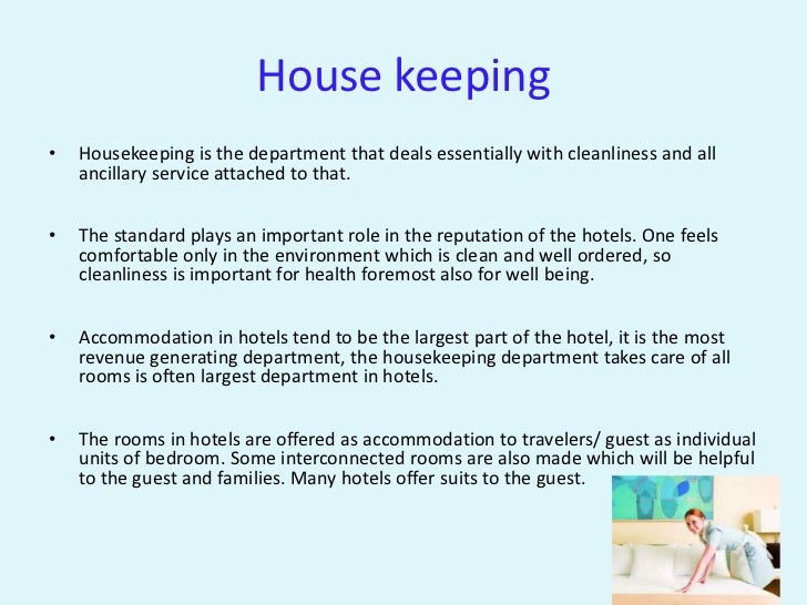 Housekeeping In Hotels Presentation. Housekeeping in hotel takes the pride in keeping the hotel clean and comfortable so as to create home away from home. Executive housekeepers may occupy greater or lesser positions in any organization.